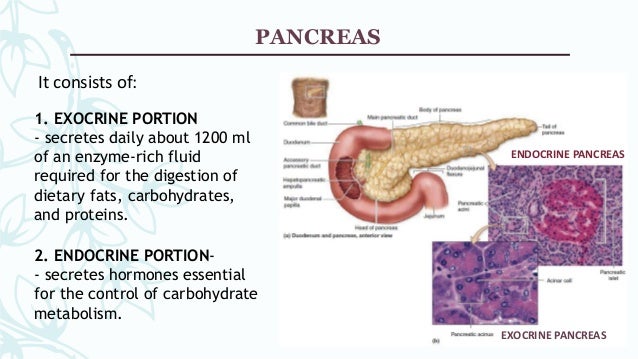 Morbidity of endocrine and exocrine pancreatic insufficiency Thirty four of 113 patients (301%) was diagnosed with DM, 33 patients (292%) with IGT and 46 patients (407%) with normal endocrine function as shown in Fig 1The incidence of abdominal pain, abdominal distension and diarrhea (including fat diarrhea) was respectively 53%, 106% and 1504%Endocrine pancreas Current time so special physiologically the pancreas releases two types of things or has two main components to it one there's the exocrine pancreas and the idea behind the exocrine pancreas is that it takes salts and write it down here enzymes so these powerful enzymes I talked about earlier it takes these salts andCancer can start in the head, body or tail of the pancreas The wide end of the pancreas is called the head The thin end is called the tail The bit in the middle is called the body Between 60 and 70 out of 100 pancreatic cancers (6070%) start in the head of the pancreas Exocrine pancreatic cancers Most pancreatic cancers are the exocrine